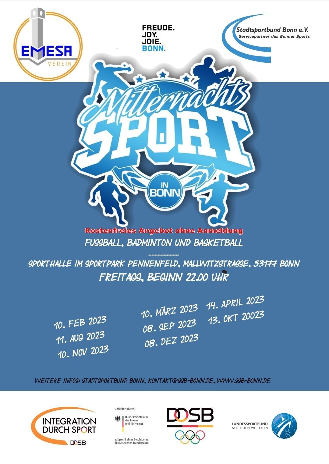Im Auftrag vom Stadtsportbund Bonn und in Zusammenarbeit mit MigraBo e.V. führt Emesa e.V. das Projekt "Mitternachtssport" durch